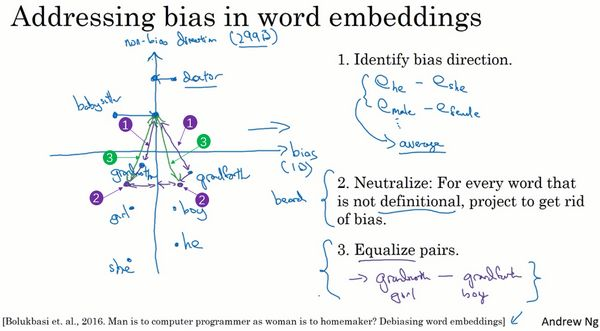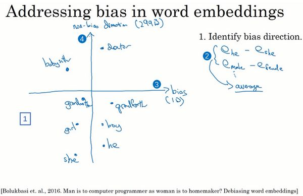 最后,你需要平衡的词对的数实际上是很小的,至少对于性别歧视这个例子来说,用手都能够数出来你需要平衡的大部分词对。完整的算法会比我在这里展示的更复杂一些,你可以去看一下这篇论文了解详细内容,你也可以通过编程作业来练习一下这些想法。