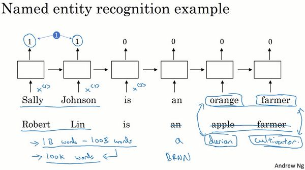 我们从一个例子开始,我们继续用命名实体识别的例子,如果你要找出人名,假如有一个句子:“Sally Johnson is an orange farmer.”(Sally Johnson是一个种橙子的农民),你会发现Sally Johnson就是一个人名,所以这里的输出为1。之所以能确定Sally Johnson是一个人名而不是一个公司名,是因为你知道种橙子的农民一定是一个人,前面我们已经讨论过用one-hot来表示这些单词, ,等等。