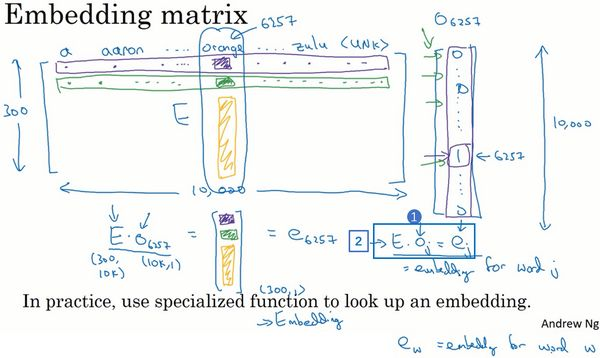 在这一小节中,要记住的一件事就是我们的目标是学习一个嵌入矩阵。在下节视频中你将会随机地初始化矩阵,然后使用梯度下降法来学习这个300×10,000的矩阵中的各个参数,乘以这个one-hot向量(上图编号1所示)会得到嵌入向量。再多说一点,当我们写这个等式(上图编号2所示)的时候,写出这些符号是很方便的,代表用矩阵乘以one-hot向量。但当你动手实现时,用大量的矩阵和向量相乘来计算它,效率是很低下的,因为one-hot向量是一个维度非常高的向量,并且几乎所有元素都是0,所以矩阵向量相乘效率太低,因为我们要乘以一大堆的0。所以在实践中你会使用一个专门的函数来单独查找矩阵的某列,而不是用通常的矩阵乘法来做,但是在画示意图时(上图所示,即矩阵乘以one-hot向量示意图),这样写比较方便。但是例如在Keras中就有一个嵌入层,然后我们用这个嵌入层更有效地从嵌入矩阵中提取出你需要的列,而不是对矩阵进行很慢很复杂的乘法运算。