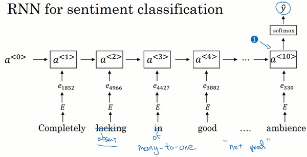 我们有一个更加复杂的模型,不用简单的把所有的词嵌入都加起来,我们用一个RNN来做情感分类。我们这样做,首先取这条评论,"Completely lacking in good taste, good service, and good ambiance.",找出每一个one-hot向量,这里我跳过去每一个one-hot向量的表示。用每一个one-hot向量乘以词嵌入矩阵,得到词嵌入表达,然后把它们送进RNN里。RNN的工作就是在最后一步(上图编号1所示)计算一个特征表示,用来预测,这是一个多对一的网络结构的例子,我们之前已经见过了。有了这样的算法,考虑词的顺序效果就更好了,它就能意识到"things are lacking in good taste",这是个负面的评价,“not good”也是一个负面的评价。而不像原来的算法一样,只是把所有的加在一起得到一个大的向量,根本意识不到“not good”和 “good”不是一个意思,"lacking in good taste"也是如此,等等。