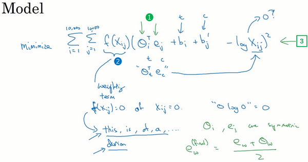 现在一些附加的细节是如果是等于0的话,那么就是未定义的,是负无穷大的,所以我们想要对为0时进行求和,因此要做的就是添加一个额外的加权项(上图编号2所示)。如果等于0的话,同时我们会用一个约定,即,这个的意思是如果,先不要进行求和,所以这个项就是不相关项。上面的求和公式表明,这个和仅是一个上下文和目标词关系里连续出现至少一次的词对的和。的另一个作用是,有些词在英语里出现十分频繁,比如说this,is,of,a等等,有些情况,这叫做停止词,但是在频繁词和不常用词之间也会有一个连续统(continuum)。不过也有一些不常用的词,比如durion,你还是想将其考虑在内,但又不像那些常用词这样频繁。因此,这个加权因子就可以是一个函数,即使是像durion这样不常用的词,它也能给予大量有意义的运算,同时也能够给像this,is,of,a这样在英语里出现更频繁的词更大但不至于过分的权重。因此有一些对加权函数f的选择有着启发性的原则,就是既不给这些词(this,is,of,a)过分的权重,也不给这些不常用词(durion)太小的权值。如果你想要知道f是怎么能够启发性地完成这个功能的话,你可以看一下我之前的幻灯片里引用的GloVe算法论文。