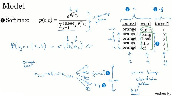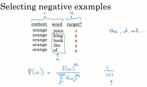 你也会在本周的编程练习中用到这个算法,这个技巧就叫负采样。因为你做的是,你有一个正样本词orange和juice,然后你会特意生成一系列负样本,这些(上图编号6所示)是负样本,所以叫负采样,即用这4个负样本训练,4个额外的二分类器,在每次迭代中你选择4个不同的随机的负样本词去训练你的算法。