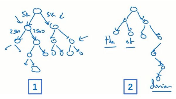 在文献中你会看到的方法是使用一个分级(hierarchical)的softmax分类器,意思就是说不是一下子就确定到底是属于10,000类中的哪一类。想象如果你有一个分类器(上图编号1所示),它告诉你目标词是在词汇表的前5000个中还是在词汇表的后5000个词中,假如这个二分类器告诉你这个词在前5000个词中(上图编号2所示),然后第二个分类器会告诉你这个词在词汇表的前2500个词中,或者在词汇表的第二组2500个词中,诸如此类,直到最终你找到一个词准确所在的分类器(上图编号3所示),那么就是这棵树的一个叶子节点。像这样有一个树形的分类器,意味着树上内部的每一个节点都可以是一个二分类器,比如逻辑回归分类器,所以你不需要再为单次分类,对词汇表中所有的10,000个词求和了。实际上用这样的分类树,计算成本与词汇表大小的对数成正比(上图编号4所示),而不是词汇表大小的线性函数,这个就叫做分级softmax分类器。