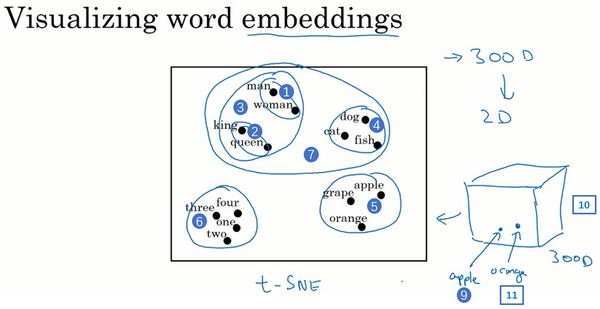 在网上你可能会看到像这样的图用来可视化,300维或者更高维度的嵌入。希望你能有个整体的概念,这种词嵌入算法对于相近的概念,学到的特征也比较类似,在对这些概念可视化的时候,这些概念就比较相似,最终把它们映射为相似的特征向量。这种表示方式用的是在300维空间里的特征表示,这叫做嵌入(embeddings)。之所以叫嵌入的原因是,你可以想象一个300维的空间,我画不出来300维的空间,这里用个3维的代替(上图编号8所示)。现在取每一个单词比如orange,它对应一个3维的特征向量,所以这个词就被嵌在这个300维空间里的一个点上了(上图编号9所示),apple这个词就被嵌在这个300维空间的另一个点上了(上图编号10所示)。为了可视化,t-SNE算法把这个空间映射到低维空间,你可以画出一个2维图像然后观察,这就是这个术语嵌入的来源。