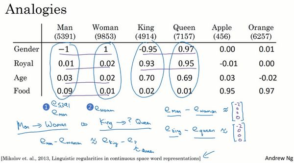 这是一系列你希望词嵌入可以捕捉的单词的特征表示,假如我提出一个问题,man如果对应woman,那么king应该对应什么?你们应该都能猜到king应该对应queen。能否有一种算法来自动推导出这种关系,下面就是实现的方法。