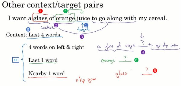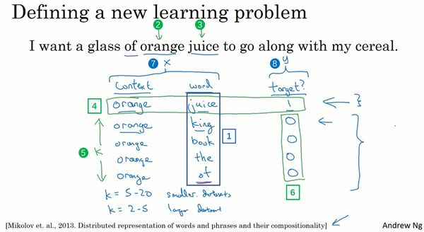 还有一个效果非常好的做法就是上下文是附近一个单词,它可能会告诉你单词glass(上图编号7所示)是一个邻近的单词。或者说我看见了单词glass,然后附近有一个词和glass位置相近,那么这个词会是什么(上图编号8所示)?这就是用附近的一个单词作为上下文。我们将在下节视频中把它公式化,这用的是一种Skip-Gram模型的思想。这是一个简单算法的例子,因为上下文相当的简单,比起之前4个词,现在只有1个,但是这种算法依然能工作得很好。