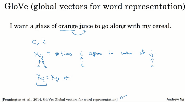 你已经了解了几个计算词嵌入的算法,另一个在NLP社区有着一定势头的算法是GloVe算法,这个算法并不如Word2Vec或是Skip-Gram模型用的多,但是也有人热衷于它,我认为可能是因为它简便吧,我们来看看这个算法。