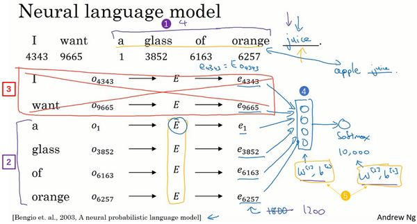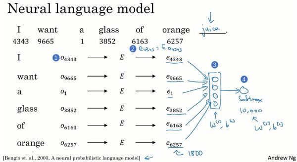 假如你在构建一个语言模型,并且用神经网络来实现这个模型。于是在训练过程中,你可能想要你的神经网络能够做到比如输入:“I want a glass of orange ___.”,然后预测这句话的下一个词。在每个单词下面,我都写上了这些单词对应词汇表中的索引。实践证明,建立一个语言模型是学习词嵌入的好方法,我提出的这些想法是源于Yoshua Bengio,Rejean Ducharme,Pascal Vincent,Rejean Ducharme,Pascal Vincent还有Christian Jauvin。