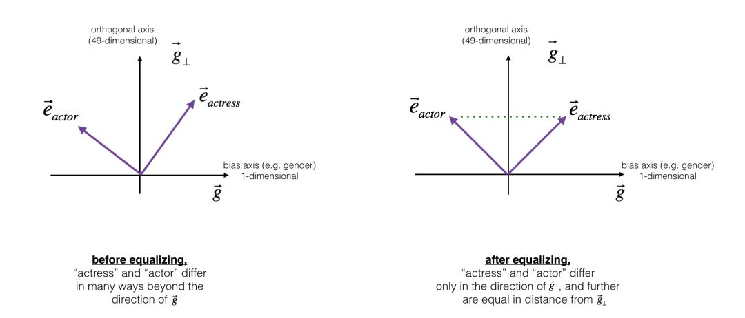 均衡背后的关键思想是确保一对特定的单词与49维距离相等 。均衡步骤还可以确保两个均衡步骤现在与 距离相同,或者用其他方法进行均衡。下图演示了均衡算法的工作原理: