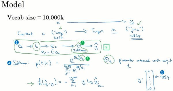 下面我们讲讲学习从映射到的监督学习模型,这(上图编号1所示:)的softmax模型。这是我们从上张幻灯片中得到的训练集,这个(上图编号2所示)将是新的输入,这个(上图编号3所示)将是你要预测的值。为了定义模型,我们将使用记号表示上下文词,记号表示可能的目标词,我再用表示0和1,表示是否是一对上下文-目标词。我们要做的就是定义一个逻辑回归模型,给定输入的,对的条件下,的概率,即: