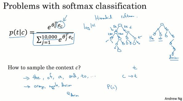 实际上使用这个算法会遇到一些问题,首要的问题就是计算速度。尤其是在softmax模型中,每次你想要计算这个概率,你需要对你词汇表中的所有10,000个词做求和计算,可能10,000个词的情况还不算太差。如果你用了一个大小为100,000或1,000,000的词汇表,那么这个分母的求和操作是相当慢的,实际上10,000已经是相当慢的了,所以扩大词汇表就更加困难了。
