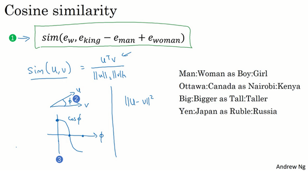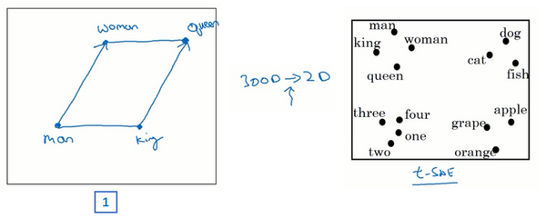 在继续下一步之前,我想再说明一下左边的这幅图(上图编号1所示),在之前我们谈到过用t-SNE算法来将单词可视化。t-SNE算法所做的就是把这些300维的数据用一种非线性的方式映射到2维平面上,可以得知t-SNE中这种映射很复杂而且很非线性。在进行t-SNE映射之后,你不能总是期望使等式成立的关系,会像左边那样成一个平行四边形,尽管在这个例子最初的300维的空间内你可以依赖这种平行四边形的关系来找到使等式成立的一对类比,通过t-SNE算法映射出的图像可能是正确的。但在大多数情况下,由于t-SNE的非线性映射,你就没法再指望这种平行四边形了,很多这种平行四边形的类比关系在t-SNE映射中都会失去原貌。