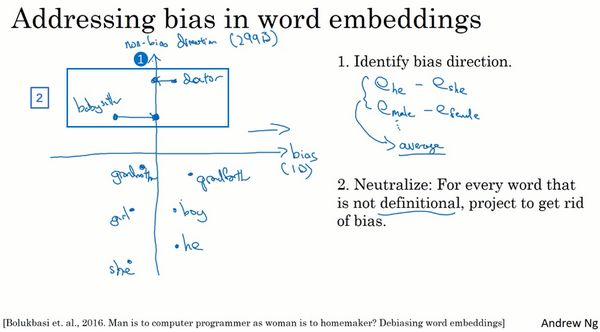 现在机器学习和人工智能算法正渐渐地被信任用以辅助或是制定极其重要的决策,因此我们想尽可能地确保它们不受非预期形式偏见影响,比如说性别歧视、种族歧视等等。本节视频中我会向你展示词嵌入中一些有关减少或是消除这些形式的偏见的办法。