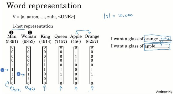 现在我们先开始讨论词汇表示,目前为止我们一直都是用词汇表来表示词,上周提到的词汇表,可能是10000个单词,我们一直用one-hot向量来表示词。比如如果man(上图编号1所示)在词典里是第5391个,那么就可以表示成一个向量,只在第5391处为1(上图编号2所示),我们用代表这个量,这里的代表one-hot。接下来,如果woman是编号9853(上图编号3所示),那么就可以用来表示,这个向量只在9853处为1(上图编号4所示),其他为0,其他的词king、queen、apple、orange都可以这样表示出来这种表示方法的一大缺点就是它把每个词孤立起来,这样使得算法对相关词的泛化能力不强。