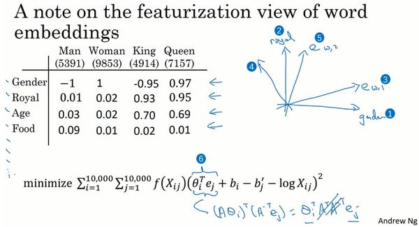 这就是GloVe算法的内容,我认为这个算法的一个疑惑之处是如果你看着这个等式,它实在是太简单了,对吧?仅仅是最小化,像这样的一个二次代价函数(上图编号3所示)是怎么能够让你学习有意义的词嵌入的呢?但是结果证明它确实有效,发明者们发明这个算法的过程是他们以历史上更为复杂的算法,像是newer language模型,以及之后的Word2Vec、Skip-Gram模型等等为基础,同时希望能够简化所有之前的算法才发明的。