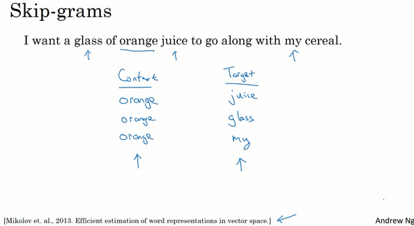 假设在训练集中给定了一个这样的句子:“I want a glass of orange juice to go along with my cereal.”,在Skip-Gram模型中,我们要做的是抽取上下文和目标词配对,来构造一个监督学习问题。上下文不一定总是目标单词之前离得最近的四个单词,或最近的个单词。我们要的做的是随机选一个词作为上下文词,比如选orange这个词,然后我们要做的是随机在一定词距内选另一个词,比如在上下文词前后5个词内或者前后10个词内,我们就在这个范围内选择目标词。可能你正好选到了juice作为目标词,正好是下一个词(表示orange的下一个词),也有可能你选到了前面第二个词,所以另一种配对目标词可以是glass,还可能正好选到了单词my作为目标词。
