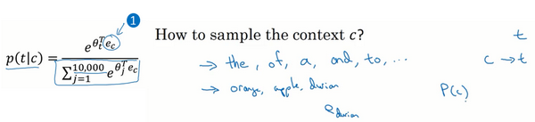 这个模型基于逻辑回归模型,但不同的是我们将一个sigmoid函数作用于,参数和之前一样,你对每一个可能的目标词有一个参数向量和另一个参数向量,即每一个可能上下文词的的嵌入向量,我们将用这个公式估计的概率。如果你有个样本,你可以把这个看作的正负样本比例,即每一个正样本你都有个对应的负样本来训练一个类似逻辑回归的模型。