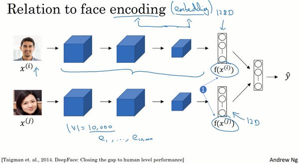 最后,词嵌入和人脸编码之间有奇妙的关系,你已经在前面的课程学到了关于人脸编码的知识了,如果你上了卷积神经网络的课程的话。你应该还记得对于人脸识别,我们训练了一个Siamese网络结构,这个网络会学习不同人脸的一个128维表示,然后通过比较编码结果来判断两个图片是否是同一个人脸,这个词嵌入的意思和这个差不多。在人脸识别领域大家喜欢用编码这个词来指代这些向量,(上图编号1所示),人脸识别领域和这里的词嵌入有一个不同就是,在人脸识别中我们训练一个网络,任给一个人脸照片,甚至是没有见过的照片,神经网络都会计算出相应的一个编码结果。上完后面几节课,你会更明白,我们学习词嵌入则是有一个固定的词汇表,比如10000个单词,我们学习向量到,学习一个固定的编码,每一个词汇表的单词的固定嵌入,这就是人脸识别与我们接下来几节视频要讨论的算法之间的一个不同之处。这里的术语编码(encoding)和嵌入(embedding)可以互换,所以刚才讲的差别不是因为术语不一样,这个差别就是,人脸识别中的算法未来可能涉及到海量的人脸照片,而自然语言处理有一个固定的词汇表,而像一些没有出现过的单词我们就记为未知单词。