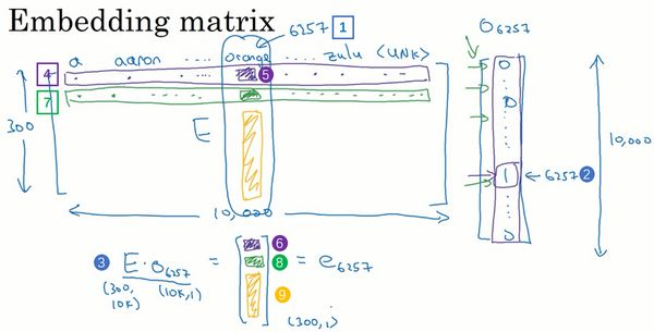 假设这个嵌入矩阵叫做矩阵,注意如果用去乘以右边的one-hot向量(上图编号3所示),也就是,那么就会得到一个300维的向量,是300×10,000的,是10,000×1的,所以它们的积是300×1的,即300维的向量。要计算这个向量的第一个元素,你需要做的是把的第一行(上图编号4所示)和的整列相乘,不过的所有元素都是0,只有6257位置上是1,最后你得到的这个向量的第一个元素(上图编号5所示)就是orange这一列下的数字(上图编号6所示)。然后我们要计算这个向量的第二个元素,就是把的第二行(上图编号7所示)和这个相乘,和之前一样,然后得到第二个元素(上图编号8所示),以此类推,直到你得到这个向量剩下的所有元素(上图编号9所示)。
