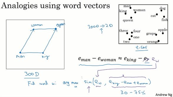 所以我做的就是我把这个全部放到等式的一边,于是等式的另一边就会是。我们有一些用于测算和之间的相似度的函数,然后通过方程找到一个使得相似度最大的单词,如果结果理想的话会得到单词queen。值得注意的是这种方法真的有效,如果你学习一些词嵌入,通过算法来找到使得相似度最大化的单词w,你确实可以得到完全正确的答案。不过这取决于过程中的细节,如果你查看一些研究论文就不难发现,通过这种方法来做类比推理准确率大概只有30%~75%,只要算法猜中了单词,就把该次计算视为正确,从而计算出准确率,在该例子中,算法选出了单词queen。