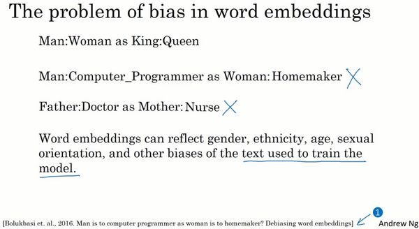 至于词嵌入,它们能够轻易学会用来训练模型的文本中的偏见内容,所以算法获取到的偏见内容就可以反映出人们写作中的偏见。在漫长的世纪里,我认为人类已经在减少这些类型的偏见上取得了进展,幸运的是对于人工智能来说,实际上我认为有更好的办法来实现更快地减少AI领域中相比与人类社会中的偏见。虽然我认为我们仍未实现人工智能,仍然有许多研究许多难题需要完成来减少学习算法中这些类型的偏见。