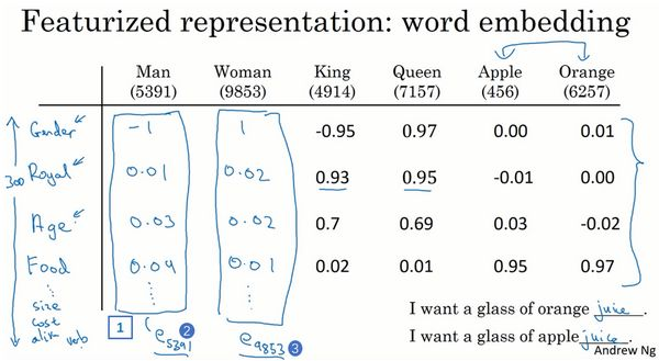 换一种表示方式会更好,如果我们不用one-hot表示,而是用特征化的表示来表示每个词,man,woman,king,queen,apple,orange或者词典里的任何一个单词,我们学习这些词的特征或者数值。