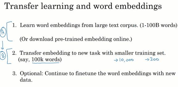 第三步,当你在你新的任务上训练模型时,在你的命名实体识别任务上,只有少量的标记数据集上,你可以自己选择要不要继续微调,用新的数据调整词嵌入。实际中,只有这个第二步中有很大的数据集你才会这样做,如果你标记的数据集不是很大,通常我不会在微调词嵌入上费力气。