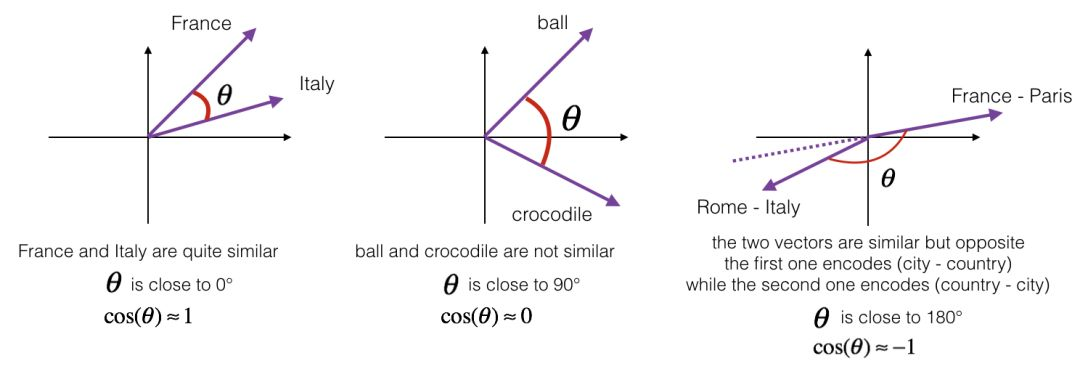 图1:两个向量之间角度的余弦是衡量它们有多相似的指标,角度越小,两个向量越相似。