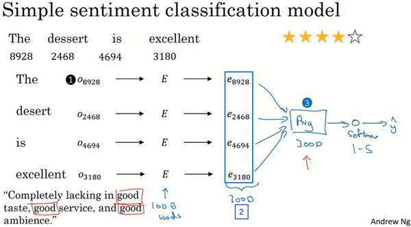 接下来你可以这样做,这节我们会讲几个不同的算法。这是一个简单的情感分类的模型,假设有一个句子"dessert is excellent",然后在词典里找这些词,我们通常用10,000个词的词汇表。我们要构建一个分类器能够把它映射成输出四个星,给定这四个词("dessert is excellent"),我们取这些词,找到相应的one-hot向量,所以这里(上图编号1所示)就是,乘以嵌入矩阵,可以从一个很大的文本集里学习到,比如它可以从一亿个词或者一百亿个词里学习嵌入,然后用来提取单词the的嵌入向量,对dessert、is、excellent做同样的步骤。