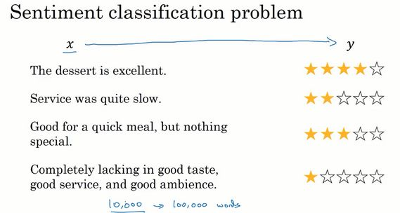 这是一个情感分类问题的一个例子(上图所示),输入是一段文本,而输出是你要预测的相应情感。比如说是一个餐馆评价的星级,