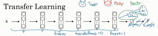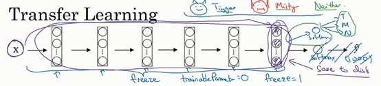 通过使用其他人预训练的权重,你很可能得到很好的性能,即使只有一个小的数据集。幸运的是,大多数深度学习框架都支持这种操作,事实上,取决于用的框架,它也许会有trainableParameter=0这样的参数,对于这些前面的层,你可能会设置这个参数。为了不训练这些权重,有时也会有freeze=1这样的参数。不同的深度学习编程框架有不同的方式,允许你指定是否训练特定层的权重。在这个例子中,你只需要训练softmax层的权重,把前面这些层的权重都冻结。