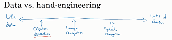 你可以认为大部分机器学习问题是介于少量数据和大量数据范围之间的。举个例子,我认为今天我们有相当数量的语音识别数据,至少相对于这个问题的复杂性而言。虽然现在图像识别或图像分类方面有相当大的数据集,因为图像识别是一个复杂的问题,通过分析像素并识别出它是什么,感觉即使在线数据集非常大,如超过一百万张图片,我们仍然希望我们能有更多的数据。还有一些问题,比如物体检测,我们拥有的数据更少。提醒一下,图像识别其实是如何看图片的问题,并且告诉你这张图是不是猫,而对象检测则是看一幅图,你画一个框,告诉你图片里的物体,比如汽车等等。因为获取边框的成本比标记对象的成本更高,所以我们进行对象检测的数据往往比图像识别数据要少,对象检测是我们下周要讨论的内容。
