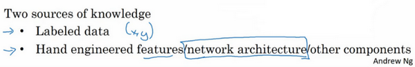 所以当我看机器学习应用时,我们认为通常我们的学习算法有两种知识来源,一个来源是被标记的数据,就像应用在监督学习。第二个知识来源是手工工程,有很多方法去建立一个手工工程系统,它可以是源于精心设计的特征,手工精心设计的网络体系结构或者是系统的其他组件。所以当你没有太多标签数据时,你只需要更多地考虑手工工程。