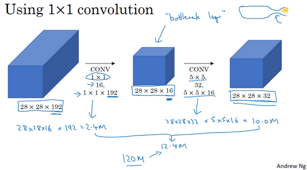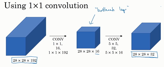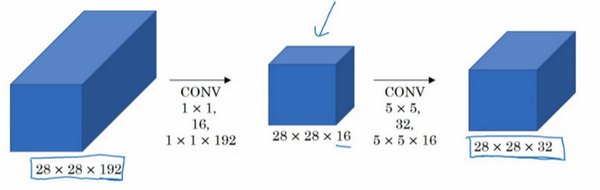 这里还有另外一种架构,其输入为28×28×192,输出为28×28×32。其结果是这样的,对于输入层,使用1×1卷积把输入值从192个通道减少到16个通道。然后对这个较小层运行5×5卷积,得到最终输出。请注意,输入和输出的维度依然相同,输入是28×28×192,输出是28×28×32,和上一页的相同。但我们要做的就是把左边这个大的输入层压缩成这个较小的的中间层,它只有16个通道,而不是192个。