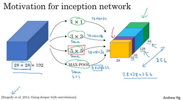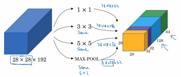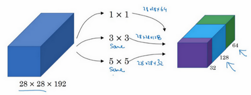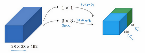如果使用3×3的过滤器,那么输出是28×28×128。然后我们把第二个值堆积到第一个值上,为了匹配维度,我们应用same卷积,输出维度依然是28×28,和输入维度相同,即高度和宽度相同。