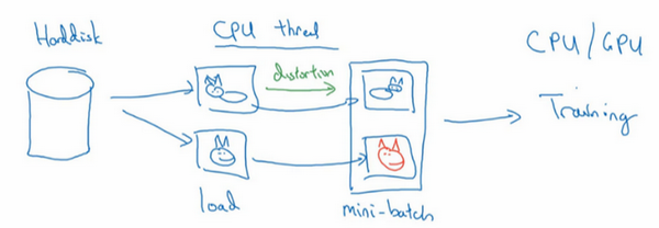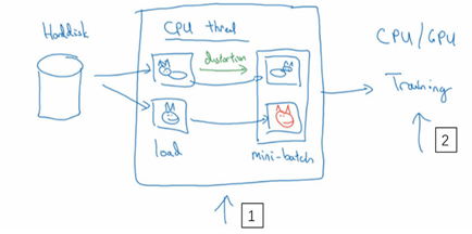 与此同时,CPU线程持续加载数据,然后实现任意失真变形,从而构成批数据或者最小批数据,这些数据持续的传输给其他线程或者其他的进程,然后开始训练,可以在CPU或者GPU上实现训一个大型网络的训练。