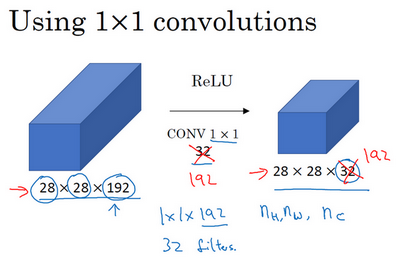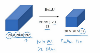 假设这是一个28×28×192的输入层,你可以使用池化层压缩它的高度和宽度,这个过程我们很清楚。但如果通道数量很大,该如何把它压缩为28×28×32维度的层呢?你可以用32个大小为1×1的过滤器,严格来讲每个过滤器大小都是1×1×192维,因为过滤器中通道数量必须与输入层中通道的数量保持一致。但是你使用了32个过滤器,输出层为28×28×32,这就是压缩通道数()的方法,对于池化层我只是压缩了这些层的高度和宽度。