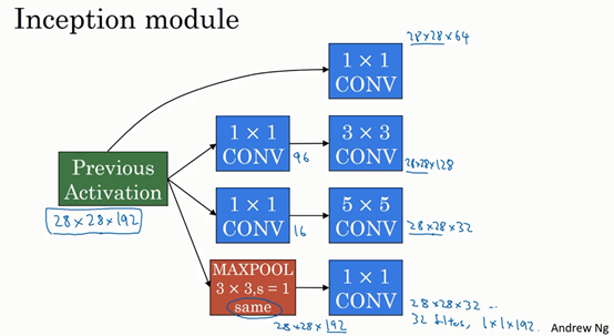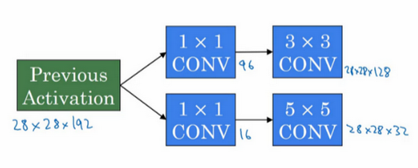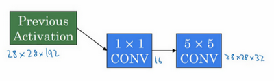 Inception模块会将之前层的激活或者输出作为它的输入,作为前提,这是一个28×28×192的输入,和我们之前视频中的一样。我们详细分析过的例子是,先通过一个1×1的层,再通过一个5×5的层,1×1的层可能有16个通道,而5×5的层输出为28×28×32,共32个通道,这就是上个视频最后讲到的我们处理的例子。