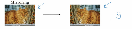 或许最简单的数据扩充方法就是垂直镜像对称,假如,训练集中有这张图片,然后将其翻转得到右边的图像。对大多数计算机视觉任务,左边的图片是猫,然后镜像对称仍然是猫,如果镜像操作保留了图像中想识别的物体的前提下,这是个很实用的数据扩充技巧。