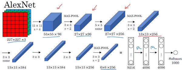 AlexNet首先用一张227×227×3的图片作为输入,实际上原文中使用的图像是224×224×3,但是如果你尝试去推导一下,你会发现227×227这个尺寸更好一些。第一层我们使用96个11×11的过滤器,步幅为4,由于步幅是4,因此尺寸缩小到55×55,缩小了4倍左右。然后用一个3×3的过滤器构建最大池化层,,步幅为2,卷积层尺寸缩小为27×27×96。接着再执行一个5×5的卷积,padding之后,输出是27×27×276。然后再次进行最大池化,尺寸缩小到13×13。再执行一次same卷积,相同的padding,得到的结果是13×13×384,384个过滤器。再做一次same卷积,就像这样。再做一次同样的操作,最后再进行一次最大池化,尺寸缩小到6×6×256。6×6×256等于9216,将其展开为9216个单元,然后是一些全连接层。最后使用softmax函数输出识别的结果,看它究竟是1000个可能的对象中的哪一个。