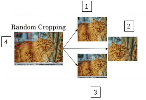 另一个经常使用的技巧是随机裁剪,给定一个数据集,然后开始随机裁剪,可能修剪这个(编号1),选择裁剪这个(编号2),这个(编号3),可以得到不同的图片放在数据集中,你的训练集中有不同的裁剪。随机裁剪并不是一个完美的数据扩充的方法,如果你随机裁剪的那一部分(红色方框标记部分,编号4),这部分看起来不像猫。但在实践中,这个方法还是很实用的,随机裁剪构成了很大一部分的真实图片。