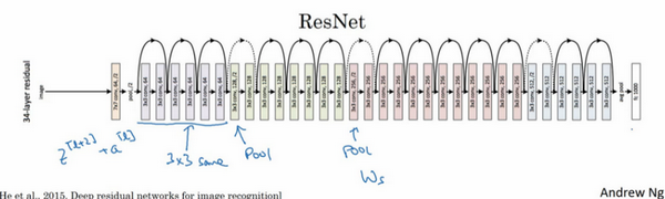 ResNet的发明者是何恺明(Kaiming He)、张翔宇(Xiangyu Zhang)、任少卿(Shaoqing Ren)和孙剑(Jiangxi Sun),他们发现使用残差块能够训练更深的神经网络。所以构建一个ResNet网络就是通过将很多这样的残差块堆积在一起,形成一个很深神经网络,我们来看看这个网络。