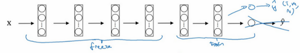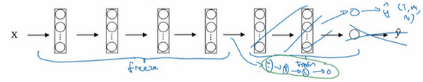 或者你可以直接去掉这几层,换成你自己的隐藏单元和你自己的softmax输出层,这些方法值得一试。但是有一个规律,如果你有越来越多的数据,你需要冻结的层数越少,你能够训练的层数就越多。这个理念就是,如果你有一个更大的数据集,也许有足够多的数据,那么不要单单训练一个softmax单元,而是考虑训练中等大小的网络,包含你最终要用的网络的后面几层。