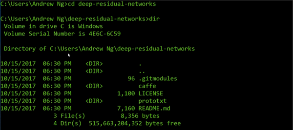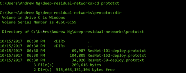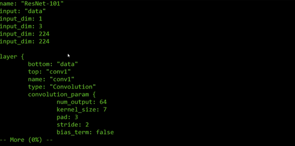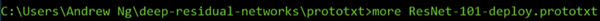 让我们进入目录,让我们看一下,比起Windows,我更习惯用Mac,不过没关系,让我们试一下,让我们进入prototxt,我认为这就是存放这些网络文件的地方。让我们看一下这个文件。因为这个文件很长,包含了ResNet里101层的详细配置。我记得,从这个网页上看到这个特殊实现使用了Caffe框架。但如果你想通过其它编程框架来实现这一代码,你也可以尝试寻找一下。