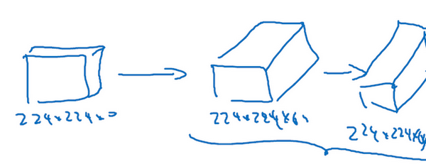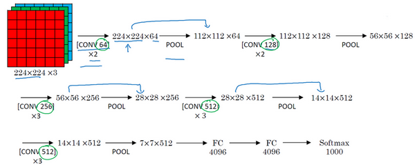 假设这个小图是我们的输入图像,尺寸是224×224×3,进行第一个卷积之后得到224×224×64的特征图,接着还有一层224×224×64,得到这样2个厚度为64的卷积层,意味着我们用64个过滤器进行了两次卷积。正如我在前面提到的,这里采用的都是大小为3×3,步幅为1的过滤器,并且都是采用same卷积,所以我就不再把所有的层都画出来了,只用一串数字代表这些网络。