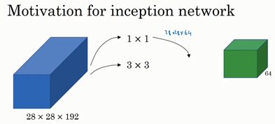 或许你还想将其直接通过一个1×1的卷积层,这时就不必在后面再跟一个1×1的层了,这样的话过程就只有一步,假设这个层的输出是28×28×64。