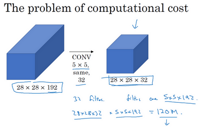 不难发现,我所描述的Inception层有一个问题,就是计算成本,下一张幻灯片,我们就来计算这个5×5过滤器在该模块中的计算成本。