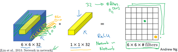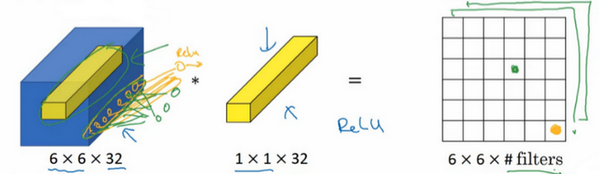 这个1×1×32过滤器中的32个数字可以这样理解,一个神经元的输入是32个数字(输入图片中左下角位置32个通道中的数字),即相同高度和宽度上某一切片上的32个数字,这32个数字具有不同通道,乘以32个权重(将过滤器中的32个数理解为权重),然后应用ReLU非线性函数,在这里输出相应的结果。