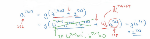 如果输入和输出有不同维度,比如输入的维度是128,的维度是256,再增加一个矩阵,这里标记为,是一个256×128维度的矩阵,所以的维度是256,这个新增项是256维度的向量。你不需要对做任何操作,它是网络通过学习得到的矩阵或参数,它是一个固定矩阵,padding值为0,用0填充,其维度为256,所以者几个表达式都可以。