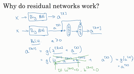 假设有一个大型神经网络,其输入为,输出激活值。假如你想增加这个神经网络的深度,那么用Big NN表示,输出为。再给这个网络额外添加两层,依次添加两层,最后输出为,可以把这两层看作一个**ResNets**块,即具有捷径连接的残差块。为了方便说明,假设我们在整个网络中使用**ReLU**激活函数,所以激活值都大于等于0,包括输入的非零异常值。因为ReLU激活函数输出的数字要么是0,要么是正数。